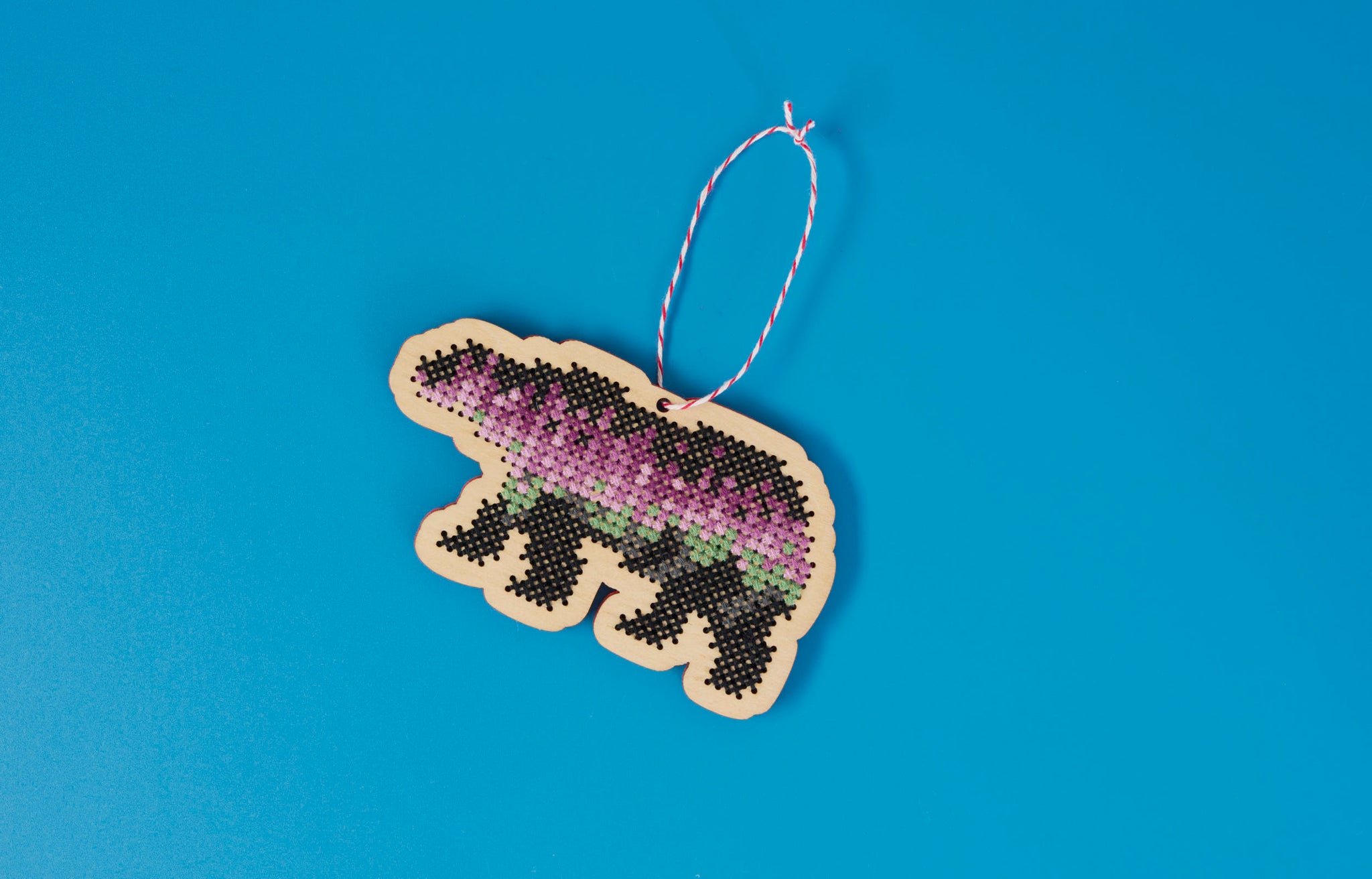 This borealis bear ornament is an easy DIY cross stitch kit that comes together in a few short hours! It's made from laser cut wood and is a great quick craft project.