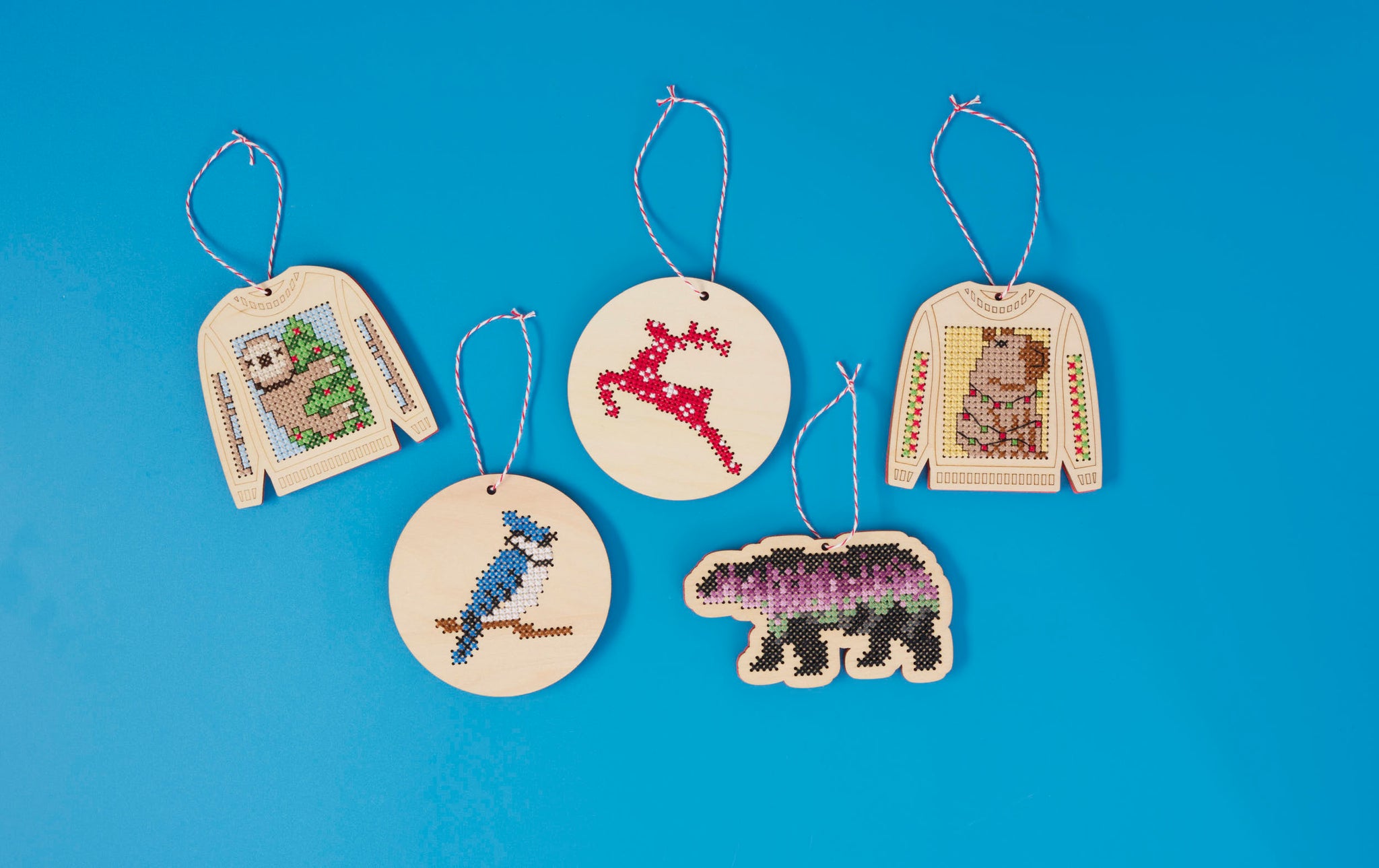 These kits are stitched on small pieces of sustainable, custom-cut laser cut birch wood. Once you've stitched it, you can simply peel and stick the adhesive felt provided over the back of your work and hang on the tree. No muss, no fuss.